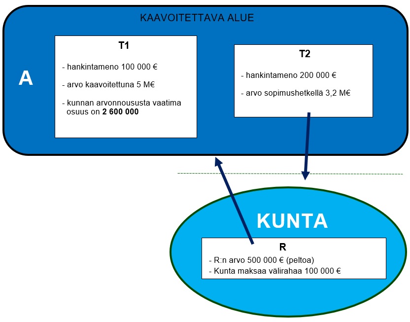 A antaa kunnalle 3 200 000 euron arvoiseksi arvioidun kiinteistön T2 ja saa sen avulla maksetuksi maankäyttömaksua 2 600 000 euroa kiinteistön T1 arvonnousun korvaukseksi sekä ostettua kunnalta kiinteistön R 500 000 eurolla. Lisäksi A saa rahaa kunnalta 100 000 euroa.