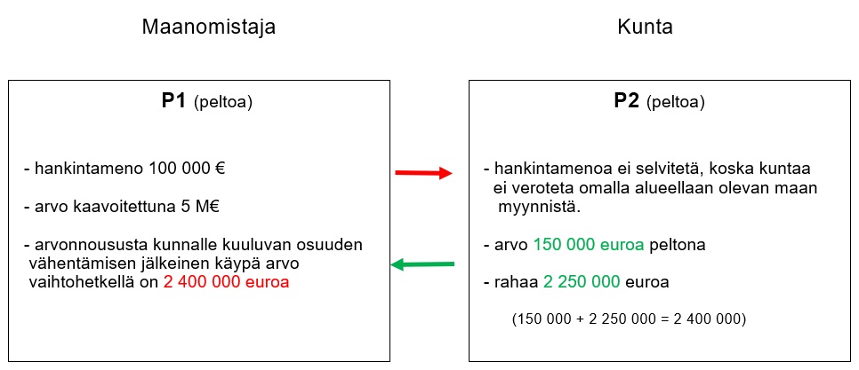 Kaavoitettava, maanomistajalle jäävä alue on taajaman läheisyydessä oleva 5 hehtaarin pelto. Pellon arvo on kyseisellä alueella 10 000 euroa hehtaarilta, joten pelkkänä peltona alueen arvo olisi noin 50 000 euroa. Koska alue on sijainniltaan hyvä ja ilman kaavaakin potentiaalista rakennusaluetta lähitulevaisuudessa, sen sopimushetken käypä arvo ylittää pelkän pellon arvon, joten alueen arvioitu arvo on 200 000 euroa. Kaavoitettuna asuinrakennuskäyttöön alueen arvo on noin 1 000 000 euroa. Arvonnousua on siten 800 000 euroa.