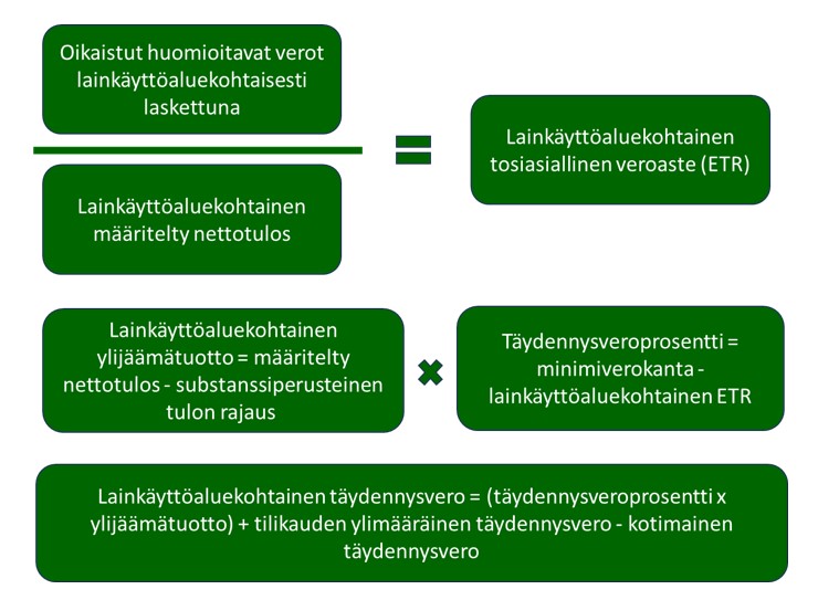 Lainkäyttöalueen tosiasiallinen veroaste saadaan jakamalla kaikkien lainkäyttöalueella sijaitsevien konserniyksiköiden yhteenlasketut oikaistut huomioitavat verot kyseisten konserniyksiköiden yhteenlasketulla määritellyllä nettotuloksella. Mikäli lainkäyttöalueen tosiasiallinen veroaste jää alle 15 prosentin, on kyseessä matalasti verotettu lainkäyttöalue, jolle on laskettava täydennysvero. Täydennysveroprosentti saadaan vähentämällä vähimmäisverokannasta (15 %) lainkäyttöalueen tosiasiallinen veroaste. Lainkäyttöalueen tilikauden täydennysvero saadaan kertomalla täydennysveroprosentti ylijäämävoiton määrällä.