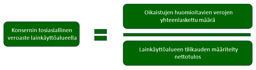 Kuva 1 havainnollistaa konsernin tosiasiallisen veroasteen ja lainkäyttöalueen tilikauden täydennysveron laskentaa.
