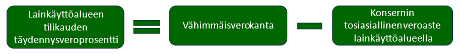 Lainkäyttöalueen tilikauden täydennysveroprosentti saadaan vähentämällä vähimmäisverokannasta (15 %) konsernin tosiasiallinen veroaste lainkäyttöalueella. Kuva 3 havainnollistaa lainkäyttöalueen täydennysveroprosentin laskentaa.