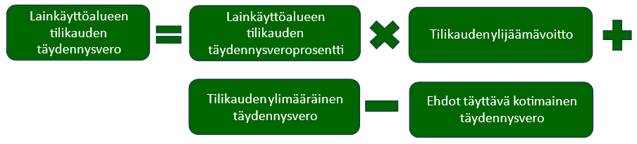 Lainkäyttöalueen tilikauden täydennysvero saadaan kertomalla lainkäyttöalueen tilikauden täydennysveroprosentti tilikauden ylijäämävoiton määrällä. Saatuun määrään lisätään mahdollinen tilikauden ylimääräinen täydennysvero (ks. luku 3.3) ja siitä vähennetään mahdollinen ehdot täyttävä kotimainen täydennysvero (ks. luku 1.2.8). Kuva 5 ja esimerkki 3 havainnollistavat lainkäyttöalueen tilikauden täydennysveron laskentaa.