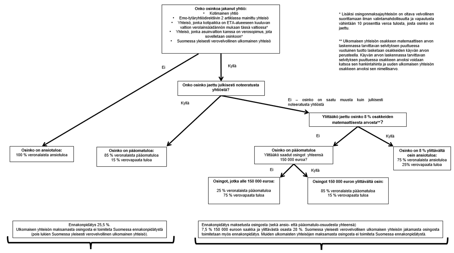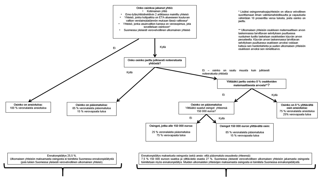 Osingonsaajan verovuonna julkisesti noteeraamattomista yhtiöistä saama pääomatulo-osinko on 150 000 euroon asti 25 prosenttisesti veronalaista pääomatuloa ja 75 prosenttisesti verovapaata tuloa. 150 000 euron ylittävästä pääomatulo-osingosta 85 prosenttia on veronalaista pääomatuloa ja 15 prosenttia verovapaata tuloa (TVL 33 b § 1 momentti). Edellä mainittu 150 000 euron raja ei ole yhtiökohtainen, vaan verovelvolliskohtainen. Siten verovelvollisen noteeraamattomista yhtiöistä verovuoden aikana saamat pääomatulo-osingot lasketaan yhteen 150 000 euron rajan täyttymistä arvioitaessa.