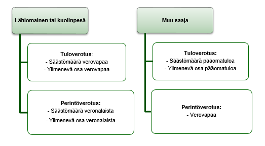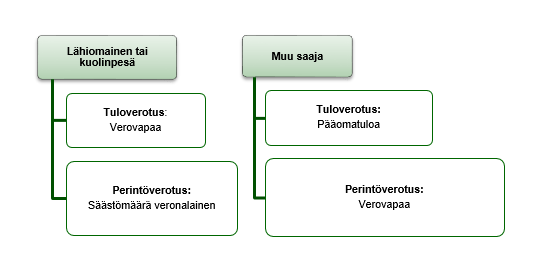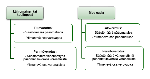 Vakuutuksen säästömäärää vastaava vakuutuskorvaus on saajalle veronalaista pääomatuloa, jos vakuutus on otettu 18.9.2009 tai sen jälkeen (TVL 36 § 2 momentti). Säästömäärän ylittävä vakuutuskorvaus on tuloverosta vapaata tuloa kuolinpesälle ja vakuutetun TVL 34 §:n 3 momentissa tarkoitetuille lähisukulaisille. Säännöksessä tarkoitettuja lähisukulaisia ovat vakuutetun puoliso, häneen suoraan ylenevässä tai alenevassa polvessa oleva perillisensä, ottolapsensa tai tämän rintaperillinen, kasvattilapsi taikka puolison lapsi. Luettelo on tyhjentävä. Muille kuin kuolinpesälle tai laissa tarkoitetulle lähisukulaiselle maksetut säästömäärän ylittävät vakuutuskorvaukset ovat pääomatuloa.