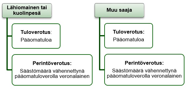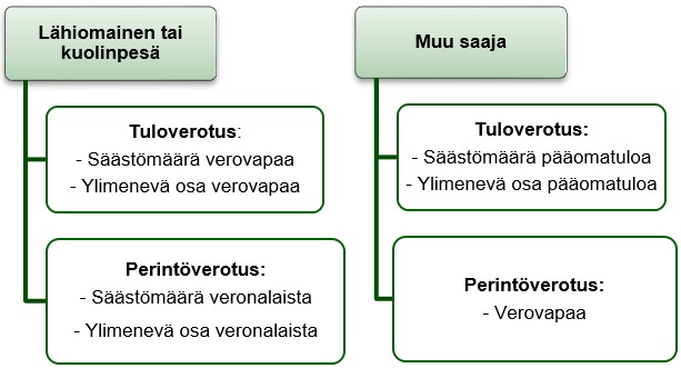 Vakuutuksen säästömäärää vastaava vakuutuskorvaus on saajalle veronalaista pääomatuloa, jos vakuutus on otettu 18.9.2009 tai sen jälkeen (TVL 36 § 2 momentti). Säästömäärän ylittävä vakuutuskorvaus on tuloverosta vapaata tuloa kuolinpesälle ja vakuutetun TVL 34 §:n 3 momentissa tarkoitetuille lähisukulaisille. Säännöksessä tarkoitettuja lähisukulaisia ovat vakuutetun puoliso, hänen suoraan ylenevässä tai alenevassa polvessa oleva perillinen, ottolapsi tai tämän rintaperillinen, kasvattilapsi taikka puolison lapsi. Luettelo on tyhjentävä. Muille kuin kuolinpesälle tai laissa tarkoitetulle lähisukulaiselle maksetut säästömäärän ylittävät vakuutuskorvaukset ovat pääomatuloa.