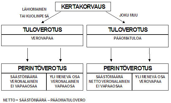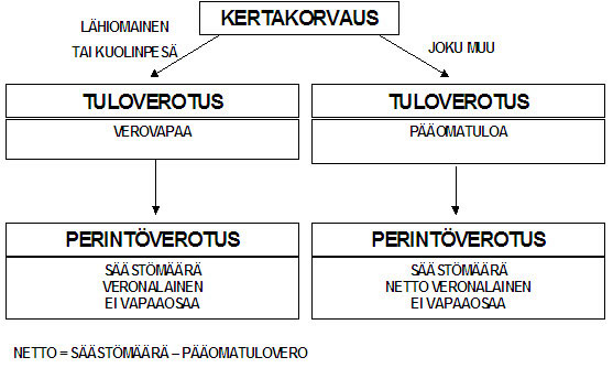 Jos kuolemantapauskorvauksen saaja on muu henkilö kuin TVL 34.3 §:n 2 kohdassa mainittu lähiomainen tai vakuutetun kuolinpesä ja kuolemantapauskorvaus ylittää säästön määrän, ylittävä osa on perintöverosta vapaata. Kuolemantapauskorvauksen koko määrä, mukaan lukien säästömäärän ylittävä osa, on tässä tilanteessa veronalaista tuloa tuloverotuksessa (TVL 34.1 § verr. TVL 36.2 §).