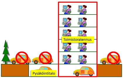 Tässä ja seuraavassa esimerkissä käytetään esimerkkinä toimistorakennusta. Vastaavia periaatteita sovelletaan myös muihin rakennustyyppeihin ja niiden alla oleviin pysäköintitiloihin.