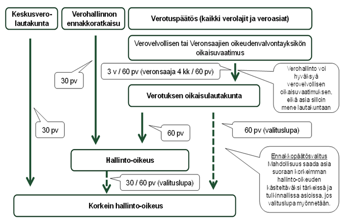 Verohallinnon tekemiin verotusta koskeviin päätöksiin haetaan pääsääntöisesti muutosta oikaisuvaatimuksella verotuksen oikaisulautakunnalta. Poikkeuksena tästä ovat ennakkoratkaisut. Verohallinnon antamaan ennakkoratkaisuun haetaan muutosta valittamalla hallinto-oikeuteen ja keskusverolautakunnan ennakkoratkaisuun valittamalla korkeimpaan hallinto-oikeuteen.