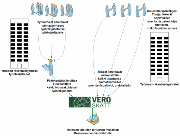 Työntekijätietoina on ilmoitettava tiedot kaikista yhteisellä rakennustyömaalla työskentelevistä henkilöistä työsuhteen laadusta tai työnantajasta riippumatta. Tiedot annetaan myös itsenäisistä ammatinharjoittajista. Työntekijätiedot annetaan työmaittain päätoteuttajan kautta. Kukin yritys ilmoittaa omat työntekijänsä työmaan päätoteuttajalle, joka toimittaa tiedot Verohallinnolle.
