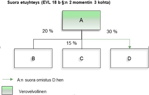 Esimerkki 1: A omistaa suoraan B:tä 20 prosenttia, C:tä 15 prosenttia ja D:tä 30 prosenttia. A ei ole EVL 18 b §:n 2 momentin 3 kohdan mukaan itsenäinen yritys, koska se omistaa suoraan 30 prosenttia D:tä.