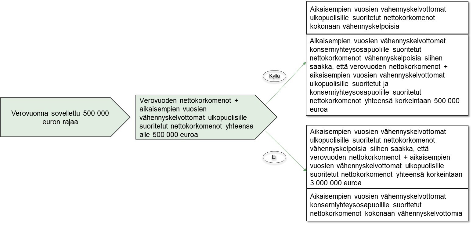 Aikaisempien verovuosien vähennyskelvottomia nettokorkomenoja voidaan aluksi vähentää nettokorkotuloja vastaava määrä (200 000 euroa) siten, että ensin vähennetään ulkopuoliselle suoritettuja nettokorkomenoja. Tämän jälkeen voidaan lisäksi aikaisempien verovuosien vähennyskelvottomia ulkopuoliselle suoritettuja nettokorkomenoja vähentää soveltaen 3 000 000 euron rajaa seuraavasti: