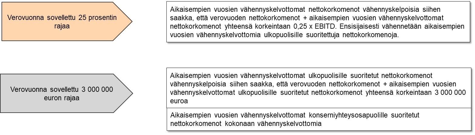 Aikaisempien verovuosien vähennyskelvottomia nettokorkomenoja voidaan aluksi vähentää verovuoden nettokorkotuloja vastaava määrä siten, että ensin vähennetään ulkopuoliselle suoritettuja nettokorkomenoja. Tämän jälkeen voidaan lisäksi aikaisempien verovuosien vähennyskelvottomia nettokorkomenoja vähentää tilanteesta riippuen soveltaen 500 000 euron tai 3 000 000 euron rajaa.