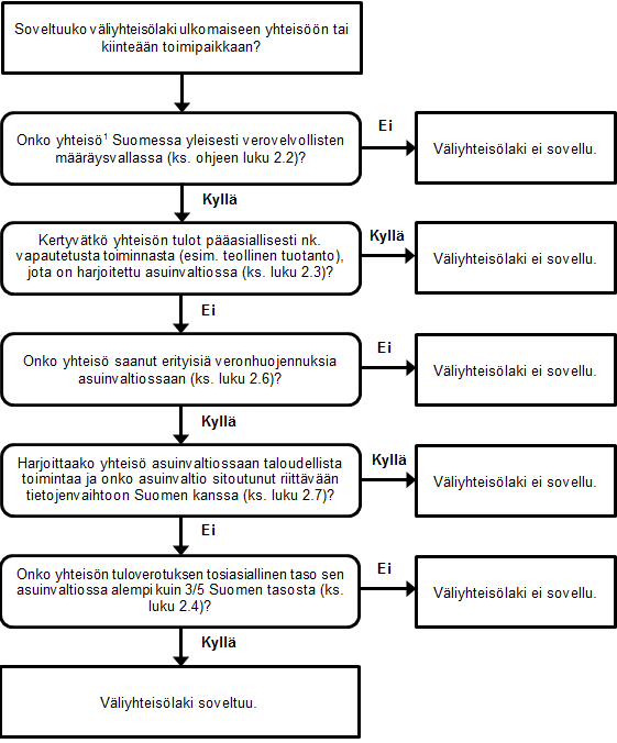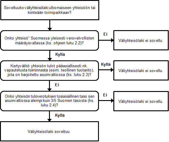 Alla olevat kaaviot on laadittu helpottamaan sen arvioimista, soveltuuko väliyhteisölaki ulkomaiseen yhteisöön yksittäisessä tilanteessa. Kaaviossa esitetyt soveltamisohjeet eivät välttämättä sovellu kaikkiin yksittäisiin tilanteisiin (ks. Esim. Luku 3.4).