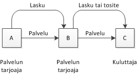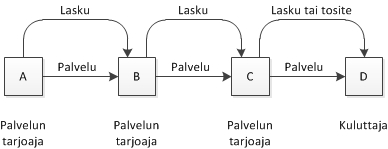 Myyntiketjussa A ja B ovat elinkeinonharjoittajia ja C on kuluttaja. A on sähköisen palvelun alkuperäinen tarjoaja ja B osallistuu palvelun myyntiin. Olettamana on että A suorittaa myynnin B:lle ja B suorittaa myynnin C:lle. B on velvollinen määrittämään myyntimaan myynnistä C:lle ja maksamaan siitä veron. A:n myynti B:lle on elinkeinonharjoittajien välinen myynti.