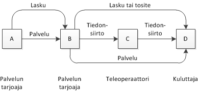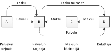 Myyntiketjussa A, B ja C ovat elinkeinonharjoittajia ja D on kuluttaja. A on sähköisen palvelun alkuperäinen tarjoaja, B osallistuu palvelun myyntiin ja C käsittelee maksua. D maksaa C:lle. B on velvollinen määrittämään myyntimaan myynnistä D:lle ja maksamaan siitä veron.