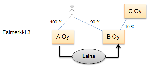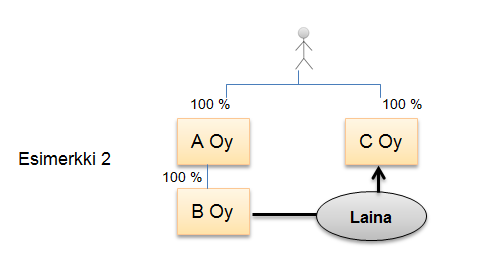 Seuraavassa esimerkissä samoilla luonnollisilla henkilöillä on määräysvalta sekä velkojayhtiössä (A Oy) että velallisyhtiössä (C Oy). EVL 16 §:n 7 kohta soveltuu, koska luonnolliset henkilöt käyttävät määräysvaltaa sekä velkoja A Oy:ssä että välillisesti B Oy:n kautta velallisyhtiö C Oy:ssä: