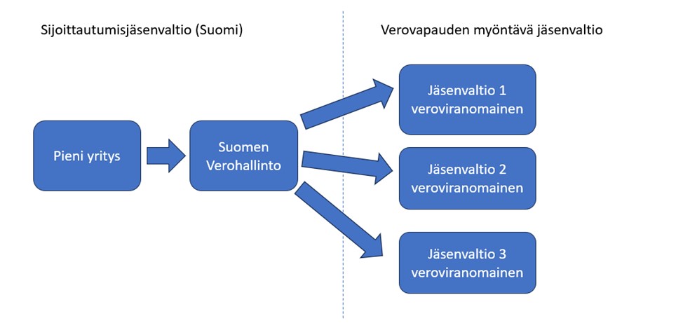 Suomalainen yritys ilmoittaa ennakkoilmoituksella soveltavansa pienten yritysten verovapautusta Virossa ja Ruotsissa. Viro myöntää ensimmäisenä verovapautuksen ja lähettää siitä tiedon Suomeen. Yritys voi alkaa harjoittamaan verosta vapautettua toimintaa Virossa, kun Suomi ilmoittaa yritykselle EX-tunnuksen.