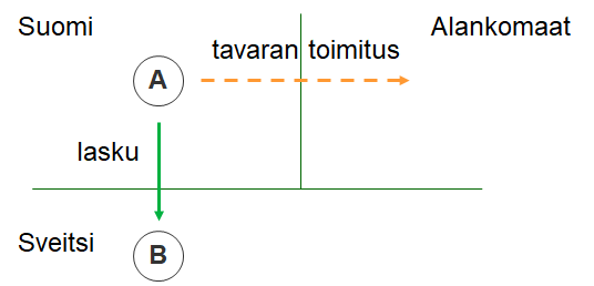 Sveitsiläinen yritys B tilaa suomalaiselta arvonlisäverovelvolliselta yritykseltä A tavaran toimitettuna Suomesta Alankomaihin. Suomalainen myyjä laskuttaa myynnistä sveitsiläistä yritystä B. Tavara kuljetetaan toiseen EU-maahan. Arvonlisäverottoman yhteisömyynnin ostajaa koskeva edellytys ei täyty, koska ostajalla ei ole voimassaolevaa arvonlisäverotunnistetta EU:ssa.