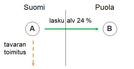Suomalainen yritys A myy muovituotteita Puolassa arvonlisäverovelvolliseksi rekisteröityneelle yritykselle B. A kuljettaa tavarat myyntiin liittyen Suomessa paikkakunnalta toiselle. Myyntiin ei liity EU-maiden rajat ylittävää kuljetusta. Kyse ei ole arvonlisäverottomasta yhteisömyynnistä vaan arvonlisäverollisesta kotimaan myynnistä. Merkitystä ei ole sillä, että ostaja ilmoittaa hänelle Puolassa annetun arvonlisäverotunnisteen myyjälle.
