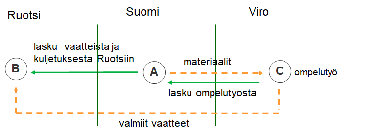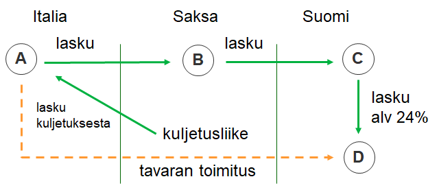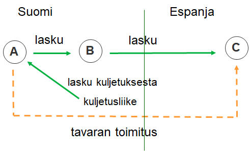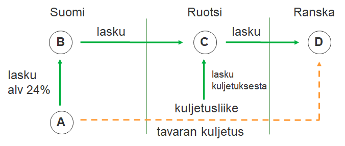 Jälkimmäinen myynti tapahtuu Suomessa. Ostaja C on arvonlisäverovelvollinen Suomessa tapahtuneesta myynnistä käännetyn verovelvollisuuden perusteella, ellei ruotsalaisella myyjällä B ole Suomessa kiinteää toimipaikkaa, tai ellei B ole rekisteröitynyt Suomeen verovelvolliseksi vapaaehtoisesti.