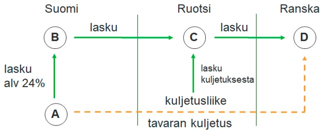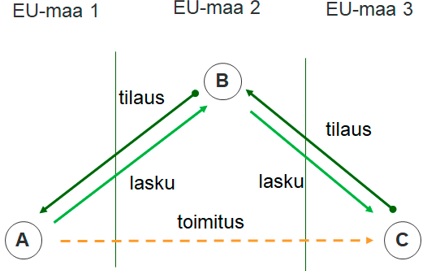 Jälkimmäinen myynti tapahtuu Suomessa. Ostaja C on arvonlisäverovelvollinen Suomessa tapahtuneesta myynnistä käännetyn verovelvollisuuden perusteella, ellei ruotsalaisella myyjällä B ole Suomessa kiinteää toimipaikkaa, tai ellei B ole rekisteröitynyt Suomeen verovelvolliseksi vapaaehtoisesti.