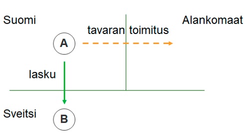 Sveitsiläinen yritys B tilaa suomalaiselta arvonlisäverovelvolliselta yritykseltä A tavaran toimitettuna Suomesta Alankomaihin. Suomalainen myyjä laskuttaa myynnistä sveitsiläistä yritystä B. Tavara kuljetetaan toiseen EU-maahan. Arvonlisäverottoman yhteisömyynnin ostajaa koskeva edellytys ei täyty, koska ostajalla ei ole voimassa olevaa arvonlisäverotunnistetta EU:n alueella.