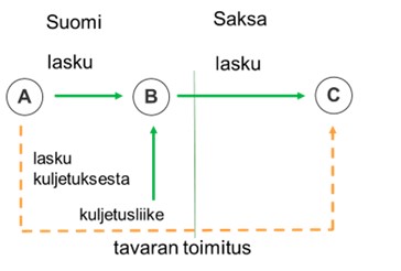 Suomalainen yritys myy prosessikoneen (ei kiinteistö) saksalaiselle yritykselle Saksaan toimitettuna. Molemmat kaupan osapuolet ovat arvonlisäverovelvollisia kotimaissaan eikä niillä ole kiinteitä toimipaikkoja ulkomailla. Myyntisopimuksen mukaan myyjä huolehtii koneen asennuksesta. Suomalainen myyjä käyttää asennustyössä saksalaista alihankkijaansa, joka veloittaa asennustyön suomalaiselta myyjäyhtiöltä. Suomalainen myyjä laskuttaa toimituksen kokonaisuudessaan (materiaali ja asennus) saksalaiselta ostajalta. Omistusoikeus koneeseen siirtyy ostajalle asennuksen jälkeen.