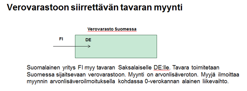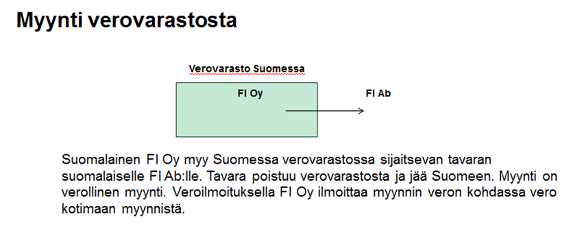 Kun tavara ja verovarasto sijaitsevat Suomessa, verovarastoon siirrettävän tavaran myynti ilmoitetaan veroilmoituksella kohdassa 0-verokannan alainen liikevaihto. Ilmoittamiseen ei vaikuta se, onko ostaja suomalainen vai ulkomaalainen (katso esimerkki 1)