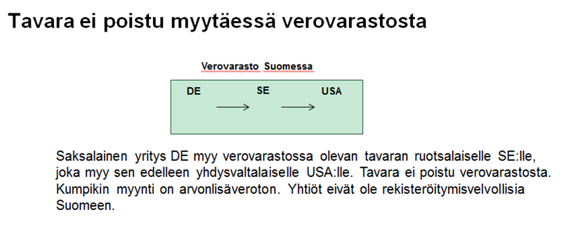 Verovarastointimenettelyssä olevan tavaran myynnistä ei suoriteta veroa tilanteessa, jossa tavara siirretään myyntiin liittyen Suomen alueella sijaitsevasta verovarastosta toiseen (AVL 72j § 3 momentti, 72h § 1 momentti 4 kohta). Kyseisessä tilanteessa tavaran katsotaan pysyvän verovarastointimenettelyssä, vaikka tavara fyysisesti siirtyy toiseen verovarastoon. Myyjä ilmoittaa verovarastossa tapahtuvan myynnin veroilmoituksella 0-verokannan alaisena myyntinä. Ulkomaalaisella myyjällä ei ole velvollisuutta rekisteröityä Suomeen arvonlisäverovelvollisten rekisteriin (katso esimerkki 5).