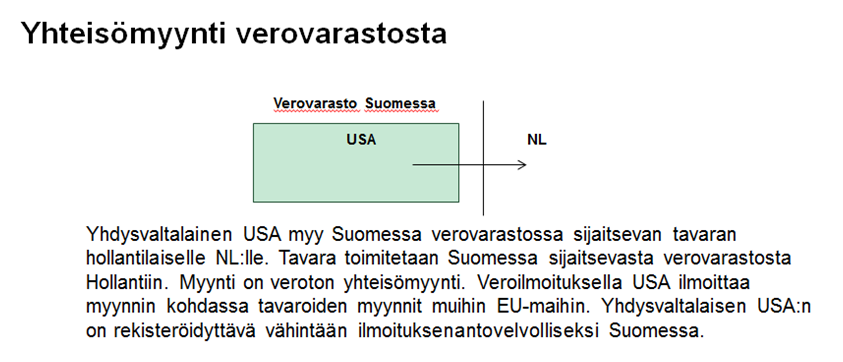 Kun tavara toimitetaan toisesta EU-maasta yhteisöhankintaan liittyen suoraan Suomessa sijaitsevaan verovarastoon, ilmoitetaan veroilmoituksella yhteisöhankintojen arvo kohdassa Tavaraostot muista EU-maista. Kohdassa Vero tavaraostoista muista EU-maista ei ilmoiteta mitään. Jos ostajana on ulkomaalainen, tulee tämän rekisteröityä Suomeen vähintään ilmoituksenantovelvolliseksi (katso esimerkki 2).