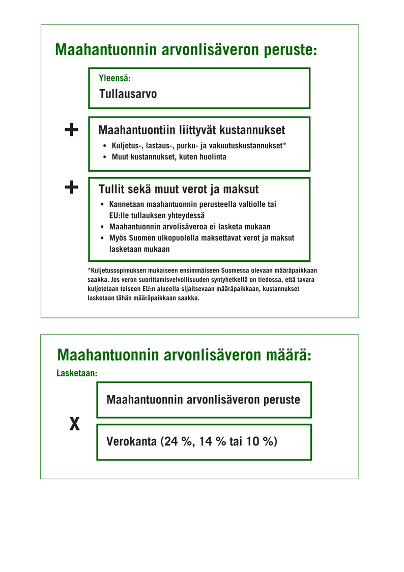 Maahantuonnin arvonlisäveron peruste ja arvonlisäveron määrä lasketaan samalla tavalla riippumatta siitä, onko toimivaltainen viranomainen Tulli vai Verohallinto.