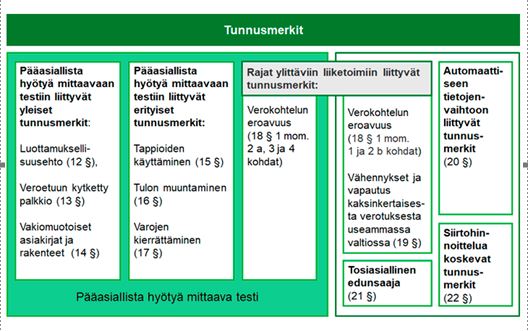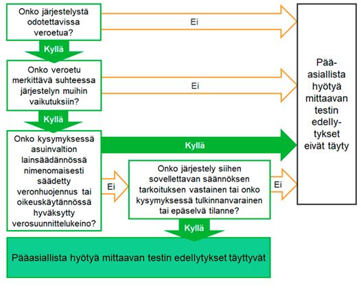 Pääasiallista hyötyä mittaavan testin edellytykset täyttyvät siis, kun veroetu on yksi järjestelystä odotettavissa olevista pääasiallisista eduista eikä kysymyksessä ole verovelvollisen asuinvaltion lainsäädännössä nimenomaisesti säädetty tai vakiintuneessa oikeus- ja verotuskäytännössä hyväksytty veroetu.