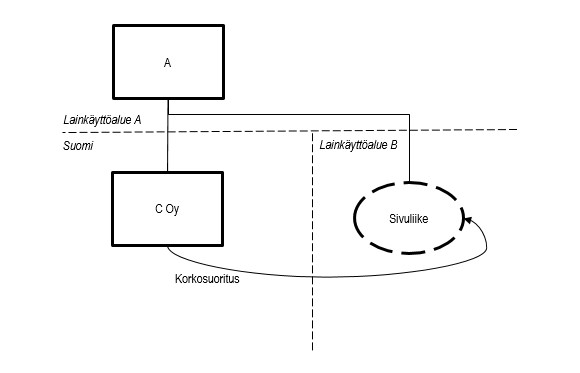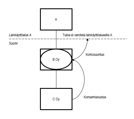 Tilanteessa syntyy vähennys ilman veropohjaan sisältymistä. C Oy:n korkomenon vähennyskelpoisuutta rajoitetaan hybridilain 7 §:n 1 momentin 1 kohdan nojalla. Jos suomalainen C Oy olisi edellä olevan sijaan maksanut koron suoraan A:lle, C Oy:n tekemää korkovähennystä olisi vastannut A:n veronalainen korkotulo.