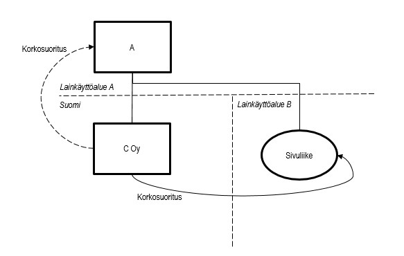 Lainkäyttöalueella A sijaitseva yksikkö omistaa suomalaisen C Oy:n ja harjoittaa liiketoimintaa lainkäyttöalueella B sijaitsevassa sivuliikkeessä. C Oy maksaa sivuliikkeelle korkosuorituksen ja vähentää sen verotuksessaan. Sivuliikkeen ei katsota muodostavan kiinteää toimipaikkaa lainkäyttöalueen B verotuksessa. Lainkäyttöalueella A sivuliikkeen katsotaan verotuksessa muodostavan kiinteän toimipaikan ja sivuliikkeen saama korkotulo kohdistetaan verotuksessa kiinteälle toimipaikalle. Lainkäyttöalueella A kiinteän toimipaikan tulo vapautetaan verosta. Sivuliikkeen saamaa korkotuloa ei verota lainkäyttöalueilla A eikä B.