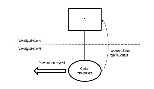Lainkäyttöalueella A asuva yhtiö tuottaa IT-palveluja asiakkaille, jotka sijaitsevat lainkäyttöalueilla A ja B. Lainkäyttöalueella B palvelut tuotetaan yhtiön kiinteästä toimipaikasta. Kiinteän toimipaikan tuloa verotetaan lainkäyttöalueella B ja pääliikkeelle suoritettu laskennallinen rojaltisuoritus pääliikkeen omistaman aineettoman omaisuuden käytöstä on vähennyskelpoinen. Yhtiötä A verotetaan lainkäyttöalueella A kiinteän toimipaikan tulosta, mutta laskennallista suoritusta ei oteta huomioon. Kiinteän toimipaikan ja pääliikkeen sijaintivaltioiden välisessä verosopimuksessa sovelletaan niin sanottua hyvitysmenetelmää eli kiinteän toimipaikan tulot ovat veronalaisia sekä lainkäyttöalueella A että B.