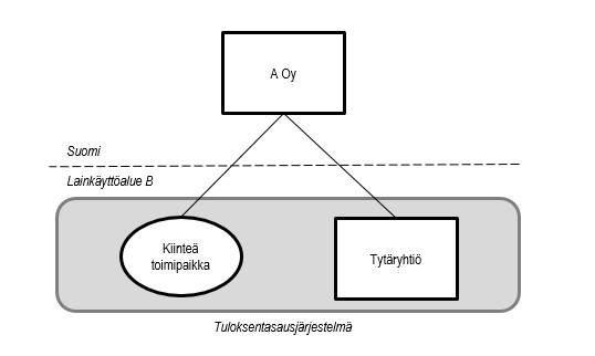 Suomessa yleisesti verovelvollinen A Oy harjoittaa liiketoimintaa myös lainkäyttöalueella B, jonne muodostuu kiinteä toimipaikka. Kiinteä toimipaikka osallistuu lainkäyttöalueella B konserniyhtiöiden väliseen verotukselliseen tuloksentasausjärjestelmään, jossa sallitaan myös järjestelmään osallistuvien yksiköiden vahvistettujen tappioiden vähentäminen myöhempien vuosien tuloksentasauksessa. Vuonna 1 kiinteän toimipaikan verotuksellinen tulos on tappiollinen lainkäyttöalueella B eikä sitä pystytä vähentämään tuloksentasausjärjestelmän puitteissakaan. Kiinteälle toimipaikalle kohdistettu tulos otetaan huomioon Suomessa A Oy:n verotuksessa ja A Oy vähentää kiinteän toimipaikan tappiollisen tuloksen kaikkia A Oy:n verotuksessa huomioon otettavia tuloja vastaan. Vuonna 2 kiinteän toimipaikan verotuksellinen tulos on nolla, mutta tuloksentasausjärjestelmän puitteissa vähennetään vuonna 1 syntynyt tappio lainkäyttöalueella B sijaitsevan A Oy:n tytäryhtiön positiivista tulosta vastaan. Vuonna 1 tilanteessa ei ole vielä syntynyt säännöksessä tarkoitettua kaksinkertaista vähennystä, vaikka mahdollisuus tähän olisi ollut. Kaksinkertainen vähennys syntyy vuonna 2.