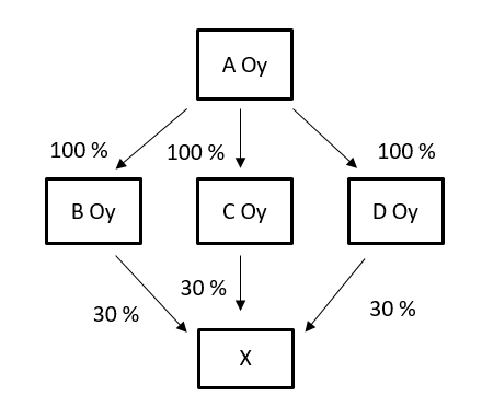 A Oy:llä on kolme täysin omistettua tytäryhtiötä, jotka puolestaan omistavat kukin 30 prosenttia ulkomaisesta yksiköstä X. A Oy:llä on tällöin 1 kohdassa tarkoitettu suora etuyhteys kaikkiin tytäryhtiöihinsä sekä välillinen etuyhteys X-yksikköön. Tytäryhtiöillä on keskenään 3 kohdassa tarkoitettu etuyhteys toisiinsa ja 2 kohdassa tarkoitettu suora etuyhteys A Oy:öön. X-yksiköllä on 3 kohdassa tarkoitettu välillinen etuyhteys kaikkiin tytäryhtiöihin ja 2 kohdassa tarkoitettu välillinen etuyhteys A Oy:öön. Kaikki esimerkissä mainitut yhtiöt kuuluvat myös hybridilain 1 §:n 3 momentissa tarkoitetulla tavalla samaan liikekirjanpidolliseen konserniin.