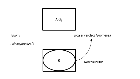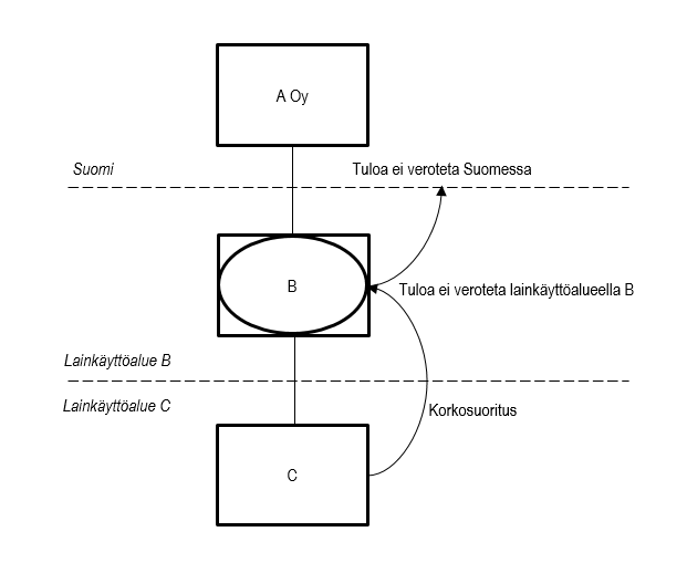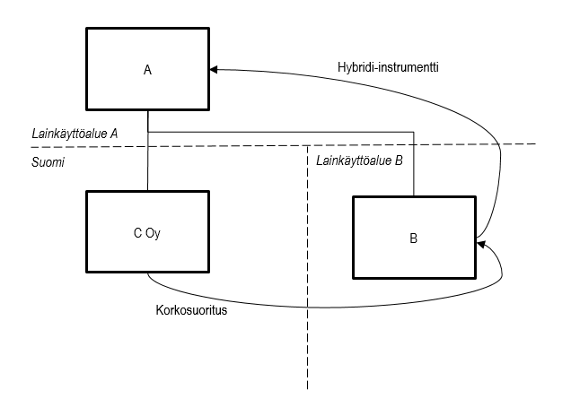 Suomalainen yhtiö C Oy on tytäryhtiö A-konsernissa, johon kuuluvat eri EU:n ulkopuolisilla lainkäyttöalueilla sijaitsevat A-emoyhtiö ja toinen tytäryhtiö B. B vähentää verotuksessaan korkosuorituksen, jonka se on maksanut A:lle. Suoritus johtaa hybridisäännöksissä tarkoitettuun verokohtelun eroavuuteen, koska lainkäyttöalueella A suoritusta pidetään lainainstrumentin ehtojen perusteella verovapaana osinkona. Lainkäyttöalueella A tai B ei sovelleta OECD:n raporttiin perustuvia direktiivin säännöksiä vastaavia säännöksiä hybridijärjestelyjen eliminoimiseksi. Suomalainen yhtiö ottaa lainan B:ltä ja maksaa tämän perusteella korkosuorituksen B:lle. Korkotulo sisältyy B:n veropohjaan. Suomalaisen yhtiön korkomenoa vastaava tulo kuittaantuu tässä tilanteessa suoraan hybridijärjestelyssä syntyvää verovaikutusta vastaan. Suomessa sovelletaan kuittaamista koskevaa säännöstä. C Oy:n menon vähennyskelpoisuutta rajoitetaan hybridilain 8 §:n 1 momentin nojalla.