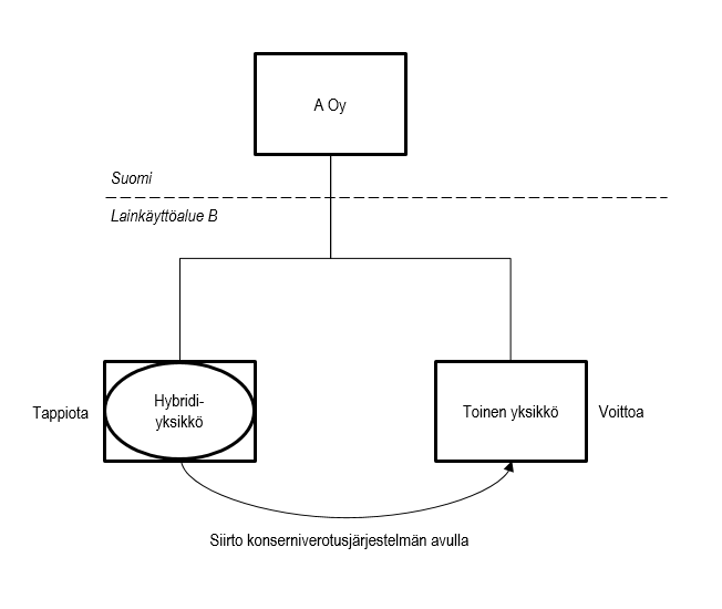 Rahoitusväline on luokiteltu suomalaisen yrityksen verotuksessa velaksi ja siihen perustuva yrityksen maksama suoritus vähennyskelpoiseksi koroksi. EU:n ulkopuolella sijaitsevalla toisella lainkäyttöalueella suorituksensaajan verotuksessa rahoitusväline on luokiteltu oman pääoman ehtoiseksi instrumentiksi ja suoritus verovapaaksi osingoksi. Suomalainen yritys ja suorituksensaaja kuuluvat samaan liikekirjanpidolliseen konserniin. Suomalaisen yrityksen korkomenon vähennyskelpoisuutta rajoitetaan hybridilain 3 §:n 1 momentin perusteella.