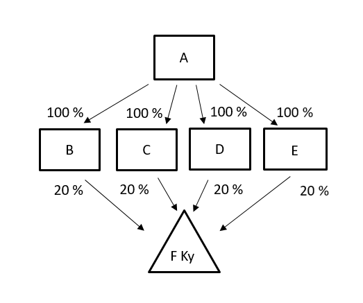 A omistaa 100 prosenttisesti yksiköt B, C, D ja E, jotka kukin ovat suomalaisen F Ky:n rajoitetusti verovelvollisia yhtiömiehiä 20 prosentin osuudella. Yhtiömiehiä ei veroteta Suomessa F Ky:stä saadusta tulo-osuudesta. Yhtiömiehet ovat hybridilain 8 a §:n 4 momentissa tarkoitetulla tavalla etuyhteydessä toisiinsa, koska A omistaa yhtiömiehet 100 prosenttisesti.