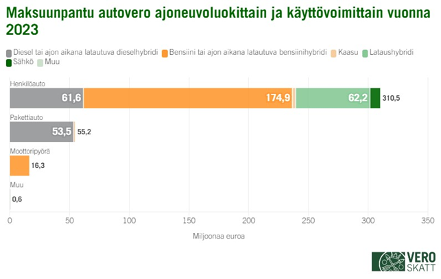 Vuonna 2023 autoveroa määrättiin noin 159 300 ajoneuvosta yhteensä 382,6 miljoonaa euroa, mikä on 120,6 miljoonaa euroa (-24,0 %) vähemmän kuin vuonna 2022. Autoverotettujen ajoneuvojen määrä kasvoi puolestaan noin 5 500 kappaleella (+3,6 %) vuodesta 2022. Autoveron määrän pienentymistä selittävät erityisesti autojen sähköistyminen sekä polttomoottoriautojen päästötason lasku. Autovero on kertaluonteinen vero, joka maksetaan Suomessa ensimmäistä kertaa rekisteröitävistä tai käyttöönotettavista henkilö- ja pakettiautoista, moottoripyöristä ja kolmi- tai nelipyöristä, esimerkiksi mönkijöistä.