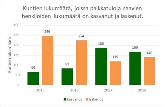 Palkkatuloja saavien henkilöiden lukumäärä laski 140 ja nousi 166 kunnassa. Palkkatulot sen sijaan laskivat vain 9 ja nousivat 300 kunnassa. Suhteellisesti eniten palkansaajien lukumäärä kasvoi Sottungassa (+13,2%) sekä Uudessakaupungissa (+5,7%). Suhteellisesti eniten laskua oli Föglössä (-5,8%) sekä Utsjoella (-5,4%).