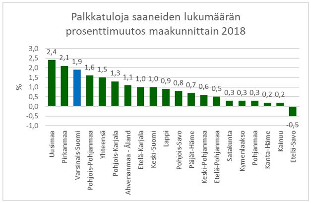 Palkkatulot kasvoivat kaikissa maakunnissa. Eniten palkkatulot kasvoivat Pirkanmaalla (+5,2%) ja vähiten Etelä-Savossa (+2,6%) ja Kanta-Hämeessä (+2,6%). Palkkaa saavien henkilöiden lukumäärä laski ainoastaan Etelä-Savon maakunnassa. Uudellamaalla palkkaa saavien lukumäärän kasvu oli maakunnista korkeinta (+2,4%).