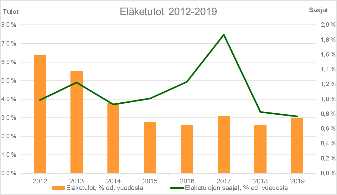 | 2018 | Eläketulot | 31 825 796 260 | 31 631 371 514 | 2,5 | 2,5 |