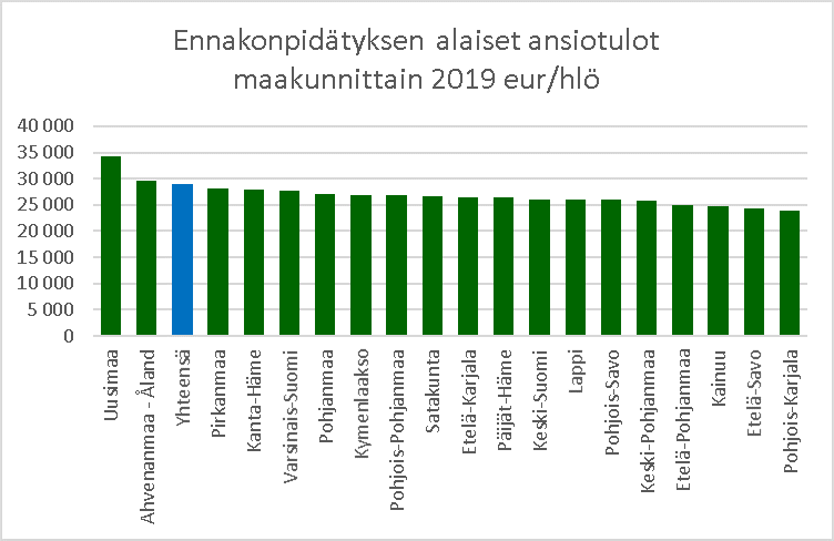 Maakuntakohtaisesti tarkasteltuna korkein keskimääräinen ennakonpidätyksen alainen ansiotulo oli Uudellamaalla ja toiseksi korkein Ahvenanmaalla, matalin puolestaan Etelä-Savossa ja Pohjois-Karjalassa.