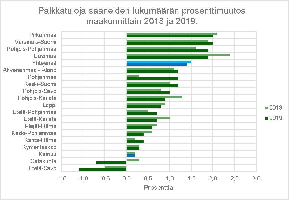 Palkkatulot kasvoivat kaikissa maakunnissa. Eniten palkkatulot kasvoivat Uudellamaalla (+4,4%) ja vähiten Etelä-Savossa (+1,2%). Palkkaa saavien henkilöiden lukumäärä laski ainoastaan Satakunnan ja Etelä-Savon maakunnissa. Pirkanmaalla ja Varsinais-Suomessa palkkaa saavien lukumäärän kasvu oli korkeinta (+2,0%).