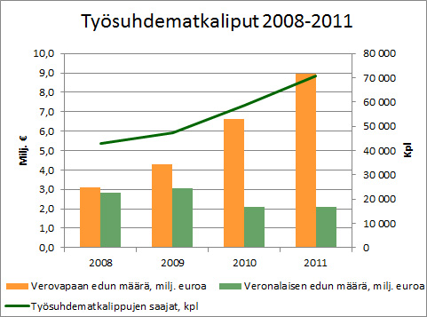 Verovuonna 2011 työnantajien luontoisetuna antamien työsuhdematkalippujen arvo oli yhteensä 11,1 miljoonaa euroa (+ 27,1 %). Tästä saajille verovapaata tuloa oli 9,0 miljoonaa euroa (+ 35,2 %) ja saajille veronalaista, palkkaan lisättävää tuloa 2,1 miljoonaa euroa (+ 1,3 %). Työsuhdematkalippuja sai yhteensä 71 000 henkilöä (+ 20,8 %).