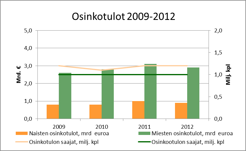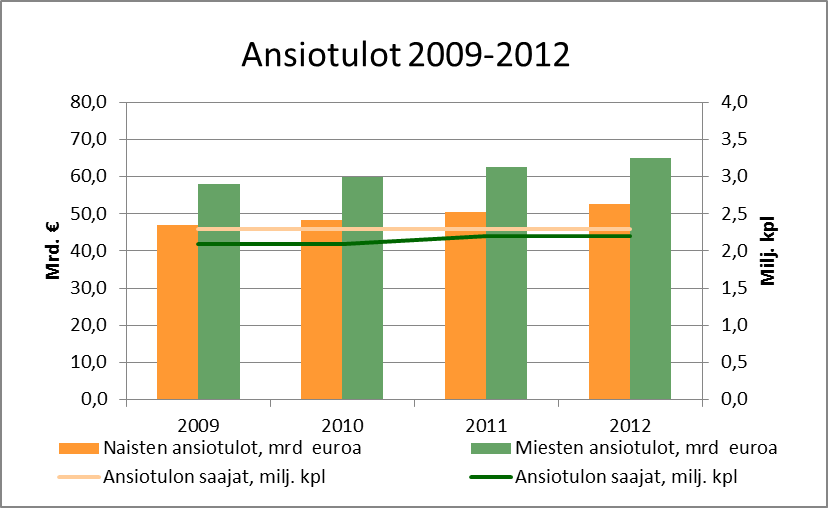 Ansiotulojen määrä henkilöasiakkailla oli vuonna 2012 yhteensä 117,65 miljardia euroa. Siitä naisten osuus oli 44,7 prosenttia ja miesten 55,3 prosenttia. Ansiotulojen määrän kasvu vuodesta 2011 oli naisilla 4,4 prosenttia ja miehillä 3,8 prosenttia. Naisten keskimääräinen ansiotulo oli 22 493 euroa/henkilö ja miesten kesimääräinen ansiotulo oli 29 920 euroa/henkilö. Keskimääräisen ansiotulon kasvu edellisestä vuodesta oli naisilla 5,6 % ja miehillä 4,4, %.
