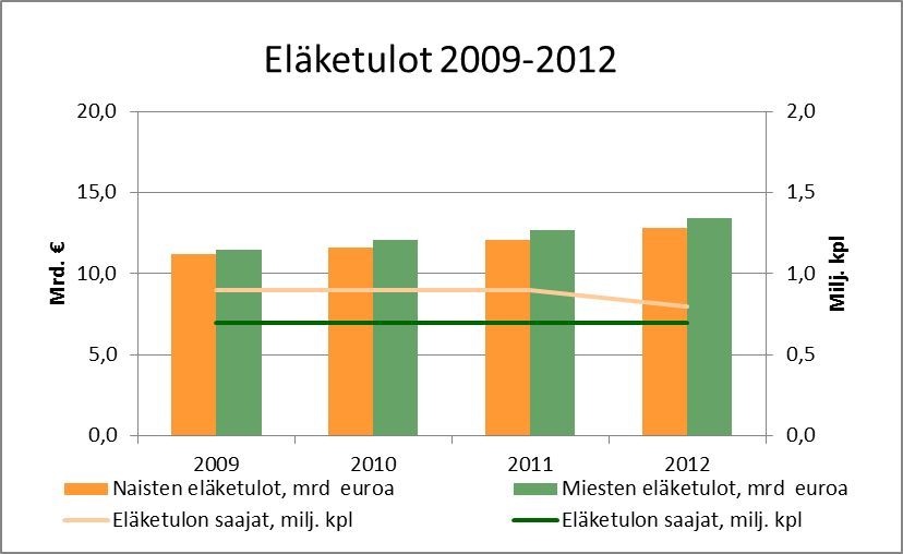 Eläketulojen yhteismäärä henkilöasiakkailla vuonna 2012 oli 26,18 miljardia euroa. Naiset saivat tästä 48,7 prosentin ja miehet 51,3 prosentin osuuden. Eläketulojen saajista miehiä oli 0,683 miljoonaa ja naisia 0,841 miljoonaa. Keskimäärin tarkasteluna naisten eläketulot olivat 15 171 euroa/henkilö ja miesten eläketulot 19 656 euroa/henkilö.