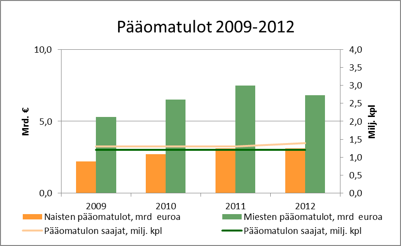 Henkilöasiakkaat saivat pääomatuloja vuonna 2012 kaiken kaikkiaan 9,95 miljardia euroa. Naisten osuus oli 31,6 prosenttia ja miesten 68,4 prosenttia. Pääomatulojen saajista naisia oli 1,364 miljoonaa ja miehiä 1,209 miljoonaa. Naisten pääomatulot kasvoivat 2,3 prosenttia vuodesta 2011. Miesten pääomatulot puolestaan laskivat 9,2 prosenttia vuodesta 2011 eli pääomatulojen kehitys verrattuna naisiin oli päinvastainen. Naisten kesimääräinen pääomatulo oli 2 301 euroa/henkilö ja miesten kesimääräinen pääomatulo oli 5 631 euroa/henkilö. Naisten kesimääräinen pääomatulo kasvoi edellisestä vuodesta 0,3 prosenttia ja miesten keskimääräinen pääomatulo aleni 10,4 prosenttia.